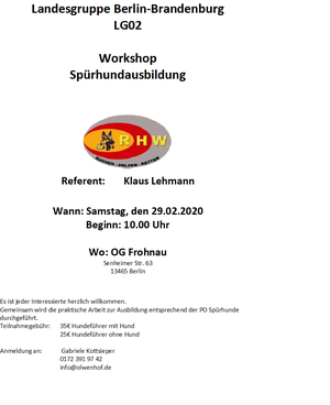 Am 29. Februar 2020 findet in der OG Frohnau ein Workshop zum Thema Spürhundausbildung statt. Nähere Informationen findet man durch das Anklicken des Bildes.