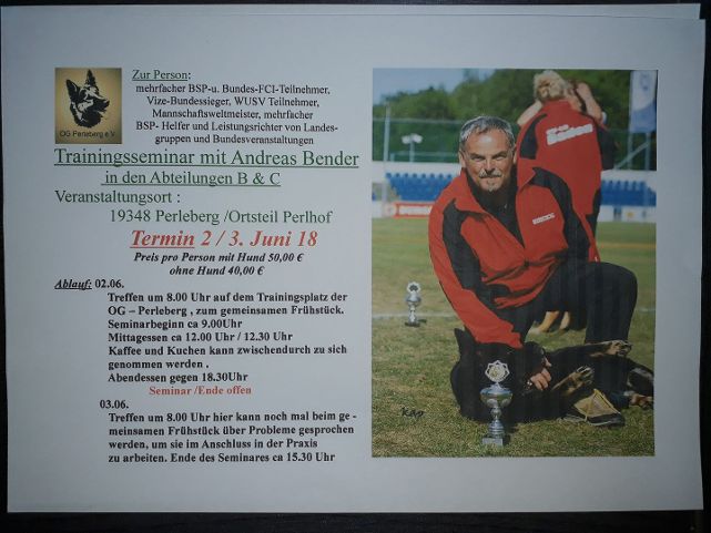 Am 02./03. Juni 2018 findet in der OG Perleberg ein Unterordnungs- und Schutzdienstseminar mit Andreas Bender statt. Die Ortsgruppe hofft auf eine rege Teilnahme, bitte meldet Euch bei Interesse zeitnah an. Den ersten Vorsitzenden der Ortsgruppe…